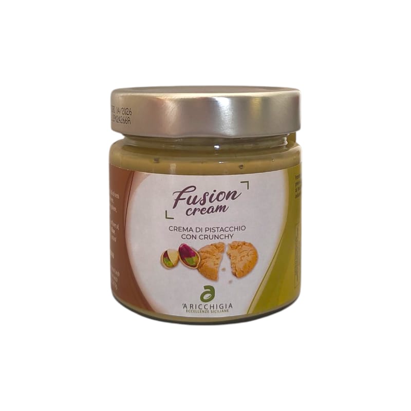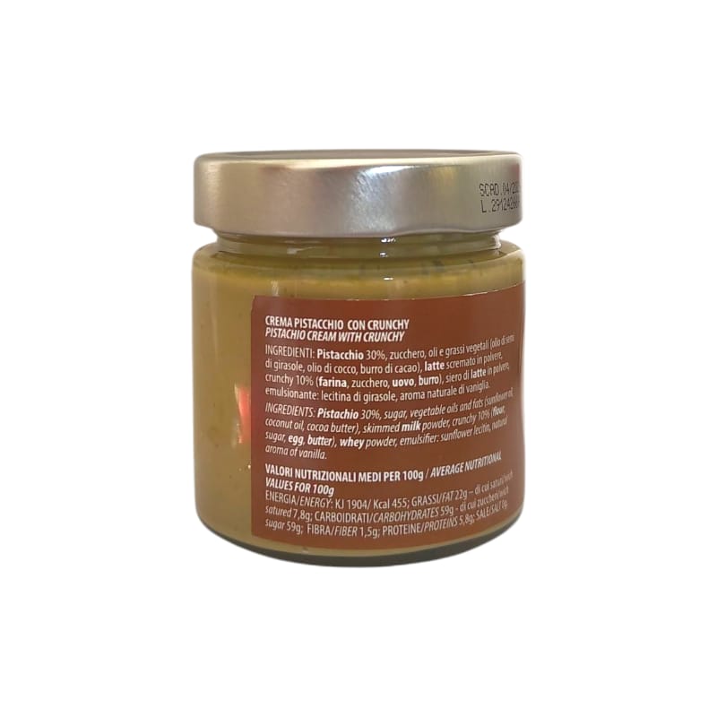Ingredienti: pistacchio 30%, zucchero, oli e grassi vegetali(olio di semi di girasole, olio di cocco, burro di cacao), latte scremato in polvere, crunchy 10% (farina, zucchero,uova, burro), siero di latte in polvere, emulsionante: lecitina di girasole, aroma naturale di vaniglia.