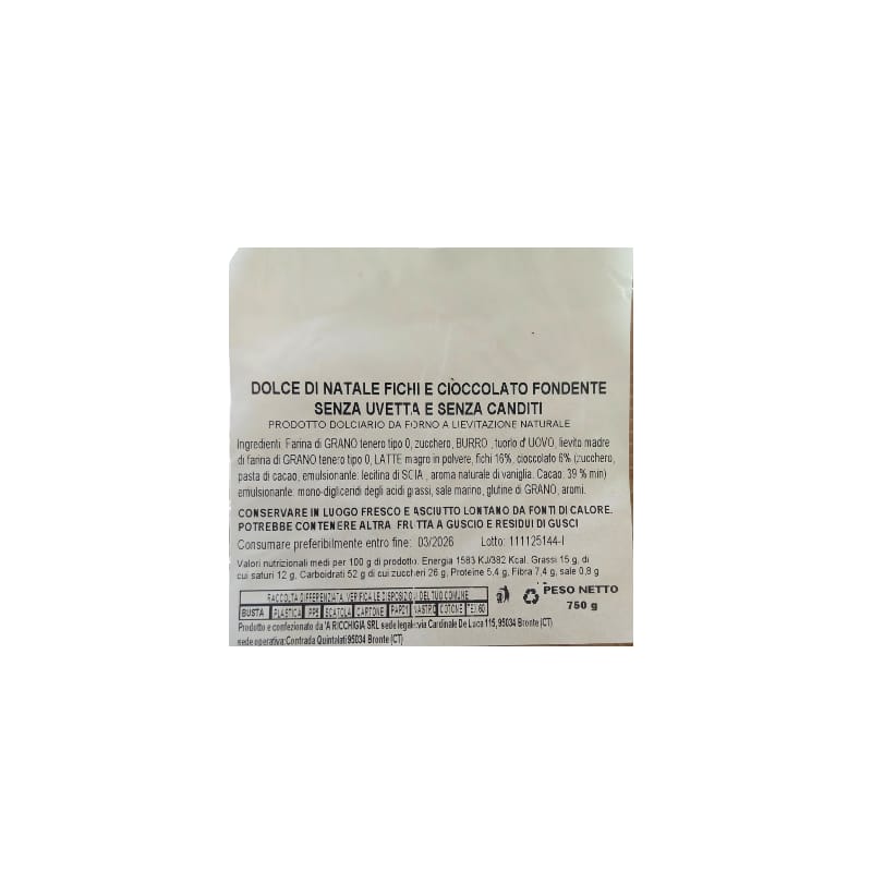 Farina di GRANO tenero tipo 0, zucchero, BURRO, tuorlo d’ UOVO, lievito madre di farina di GRANO tenero tipo 0, LATTE magro in polvere, fichi 16%, cioccolato 6% (zucchero, pasta di cacao, emulsionante: lecitina di SCIA, aroma naturale di vaniglia. Cacao: 39% min) emulsionante: mono-digliceridi degli acidi grassi, sale marino, glutine di GRANO, aromi.