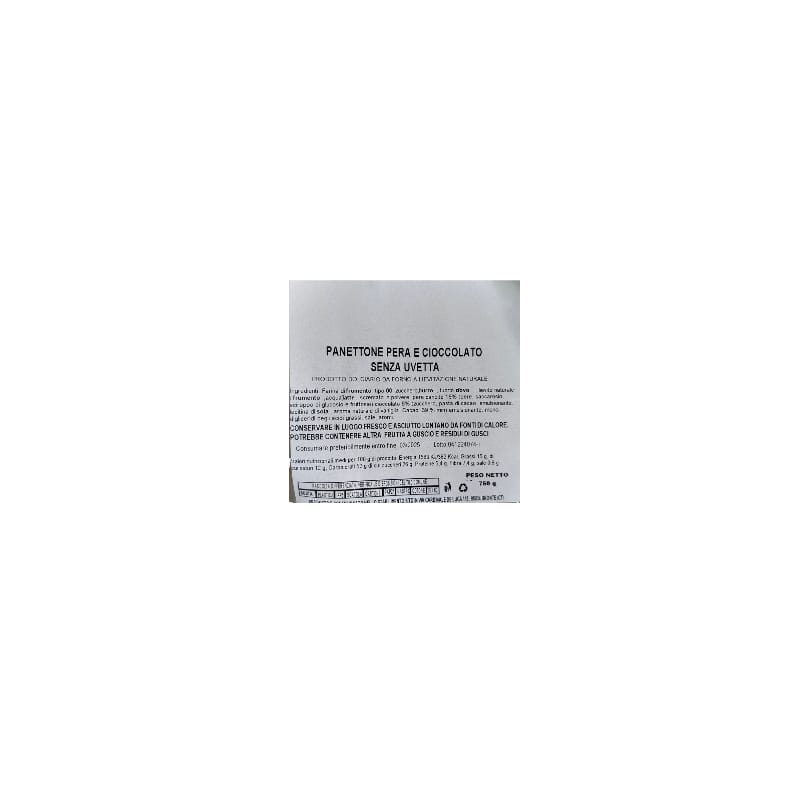 Ingredienti: Farina di frumento tipo 00, zucchero burro tuorlo d’uovo lievito naturale frumento acqua latte scremato in polvere, pere candite 16% (pere, saccarosio, sciroppo di glucosio e fruttosio) cioccolato 6% (zucchero, pasta di cacao, emulsionante lecitina di soia, aroma naturale di vaniglia Cacao: 39% min), emulsionante mono-digliceridi degli acidi grassi, sale, aromi.