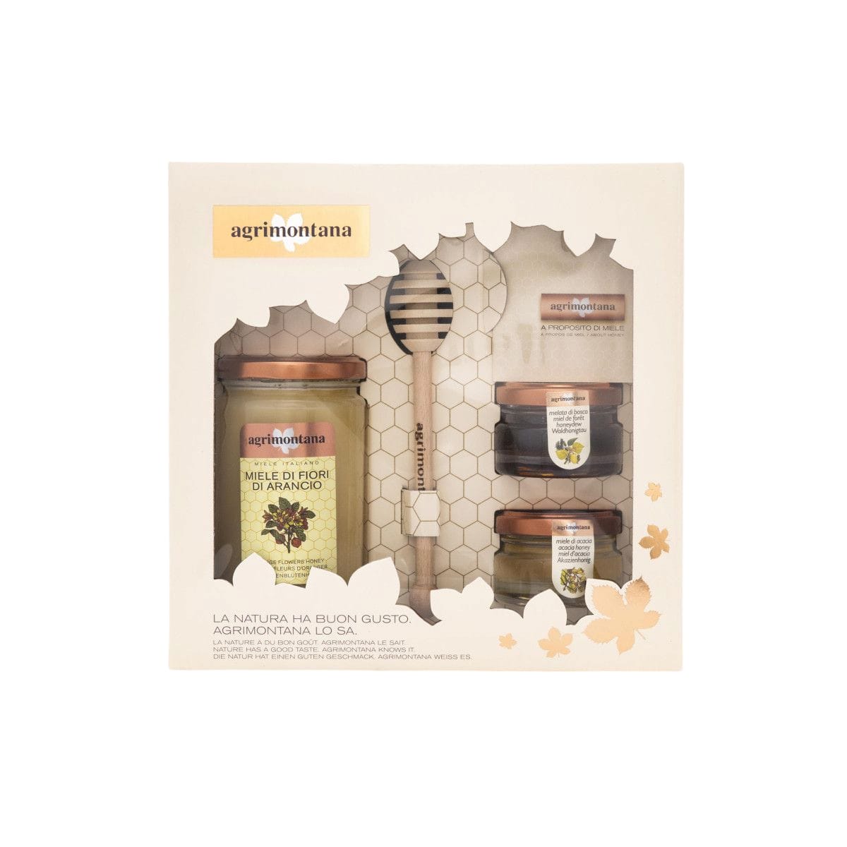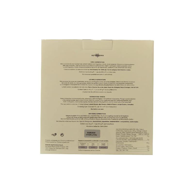 Un’elegante confezione regalo che celebra l’eccellenza dei mieli Agrimontana, estratti con il metodo della centrifugazione a freddo per preservarne la qualità. L’astuccio include un pregiato vaso da 400 g di miele fiori d’arancio, accompagnato da due raffinati vasetti da 42 g ciascuno, con melata di bosco e miele di acacia, per un’armoniosa varietà di aromi. Completa il dono un pratico e raffinato dosamiele in legno, firmato Agrimontana, per rendere ogni degustazione ancora più speciale.