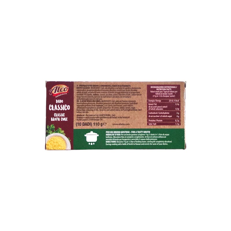 Ingredienti: Sale, olio di palma, esaltatori di sapidità: glutammato monosodico, guanilato disodico é inosinato disodico, estratto per brodo (da soia), amido di mais, estratto di came, estratto di lievito, ortaggi disidratati in proporzione variabile 1% (cipolla, sedano, carota), zucchero, aromi, colorante: E150c