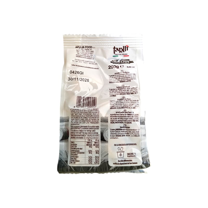 Ingredienti: Farina di GRANO tenero (UE), olio di semi di girasole alto oleico, vino bianco, sale, olio extravergine di oliva, pepe nero 0,5%, aroma.