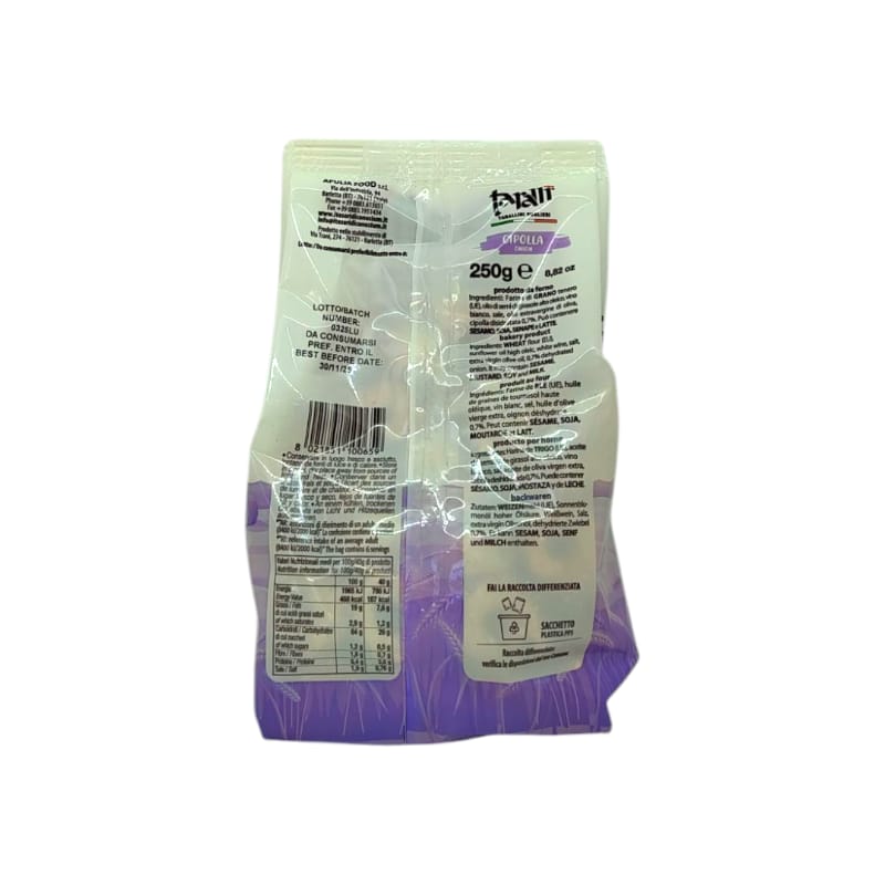 Ingredienti: farina di grano tenero (UE), olio di semi di girasole alto oleico, vino bianco, sale, olio extra vergine di oliva, cipolla disidratata 0.7%.