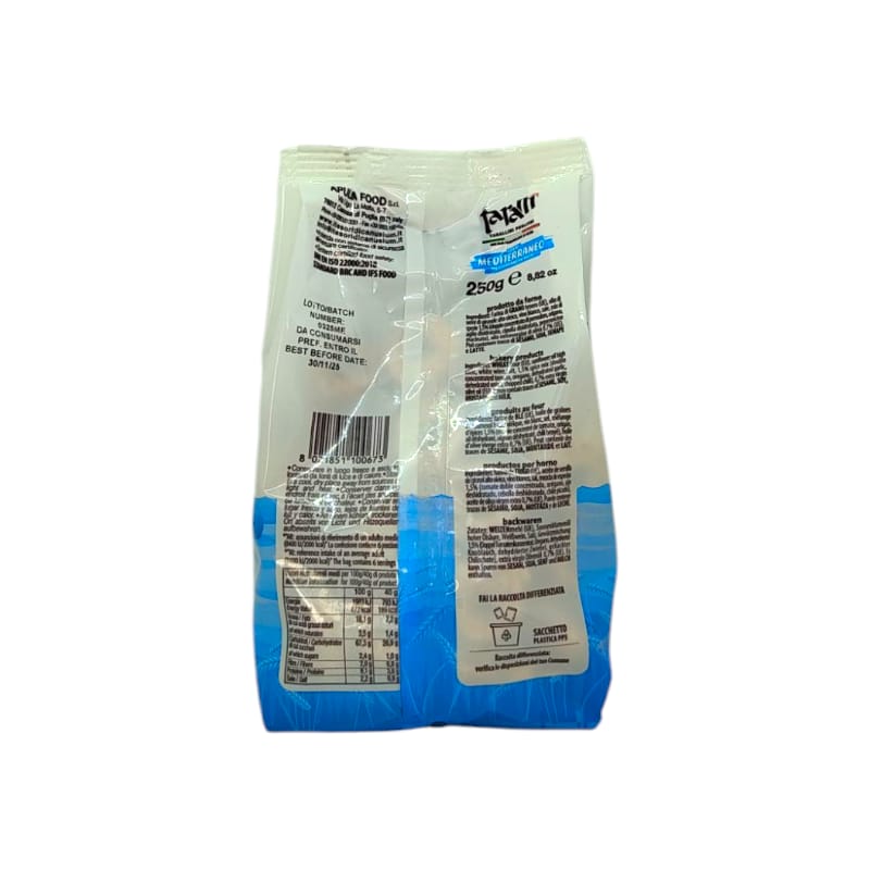 Ingredienti: farina di grano tenero (UE), olio di semi di girasole alto oleico, vino bianco, sale, mix di spezie 1.5% (doppio concentrato di pomodoro, origano, aglio disidratato, cipolla disidratata, peperoncino macinato), olio extra vergine di oliva 0.7%