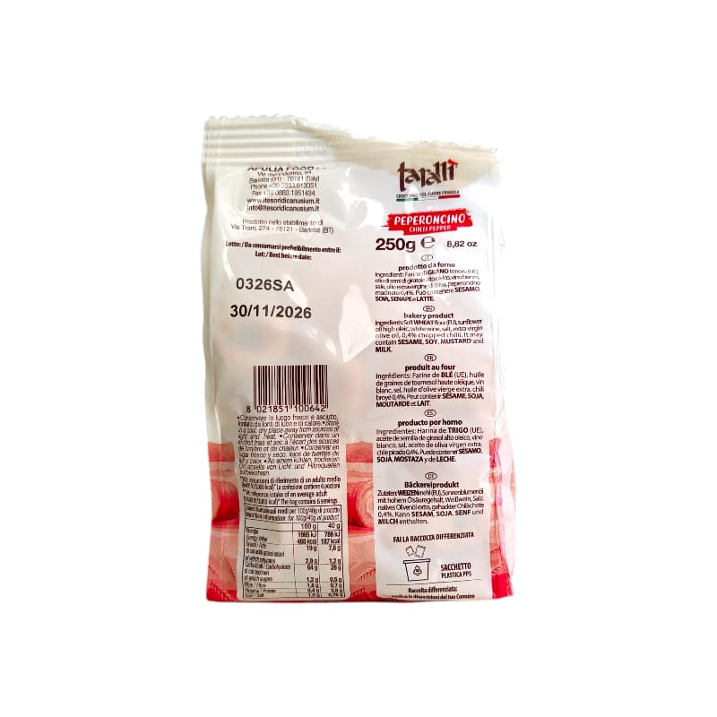 Ingredienti: farina di grano tenero (UE), olio di semi di girasole alto oleico, vino bianco, sale, olio extra vergine di oliva, peperoncino macinato 0,4%.