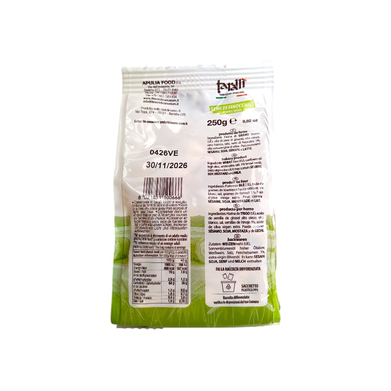Ingredienti: farina di grano tenero (UE), olio di semi di girasole alto oleico, vino bianco, semi di finocchio 1%, sale, olio extra vergine di oliva.