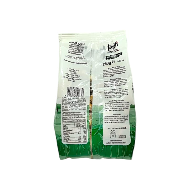 Ingredienti: farina di grano tenero (UE), olio di semi di girasole alto oleico16%, vino bianco, sale, olio extra vergine di oliva 0.7%