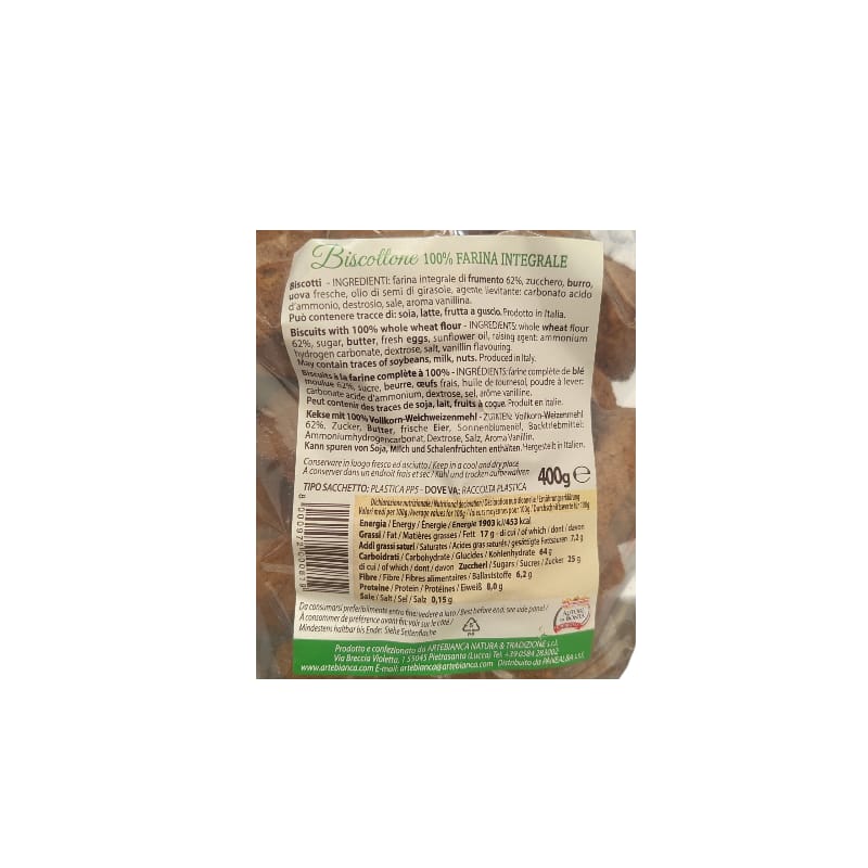 L’Artebianca Biscottone Integrale da 400g è un frollino rustico e genuino, realizzato con farina 100% integrale per garantire un elevato apporto di fibre e un sapore pieno. La sua consistenza croccante e la forma generosa lo rendono il compagno ideale per l’inzuppo nel latte o nel tè, mantenendo intatta tutta la fragranza dei cereali. Preparato seguendo metodi artigianali e con ingredienti selezionati, rappresenta una scelta salutare e gustosa per chi desidera iniziare la giornata con un carico di energia naturale.