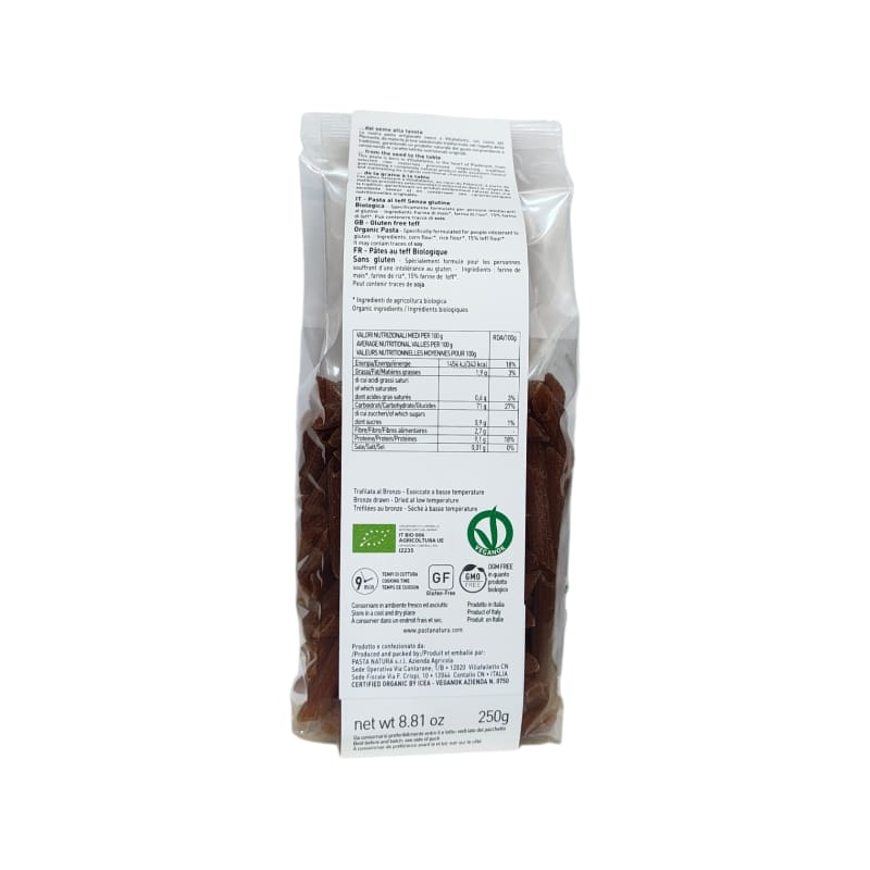 Ingredienti: farina di mais*, farina di riso*, 15% farina di teff*. *Da agricoltura biologica