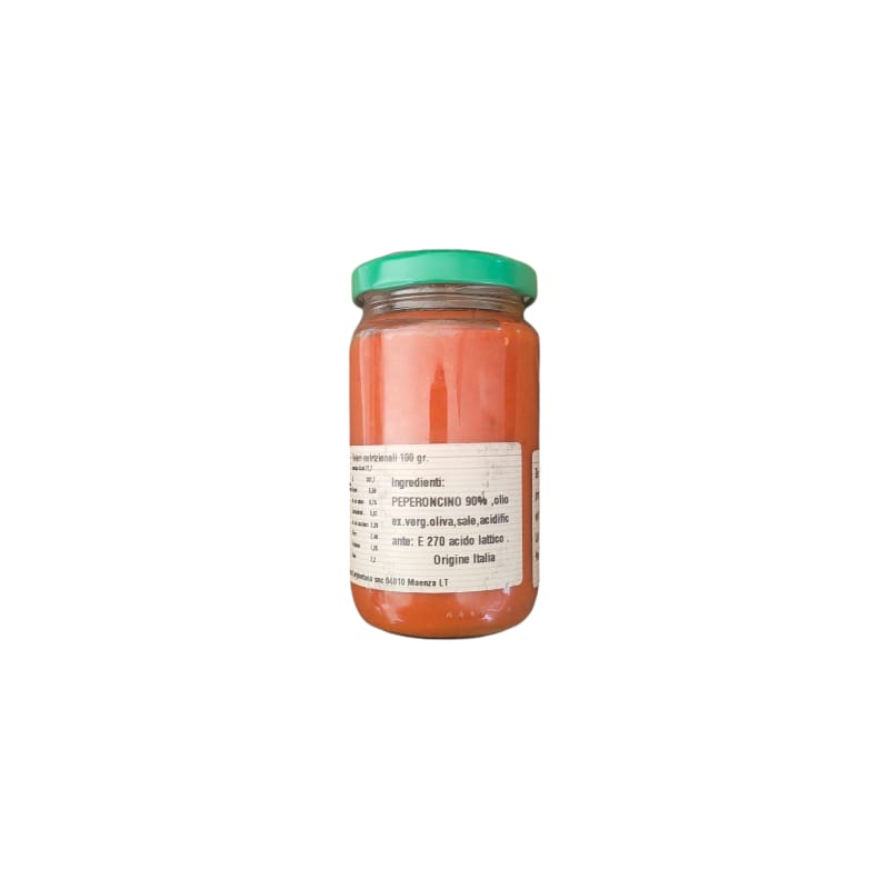 Ingredienti: peperoncino 90%, olio extra vergine di oliva, sale, acidificante: E270 acido lattico.