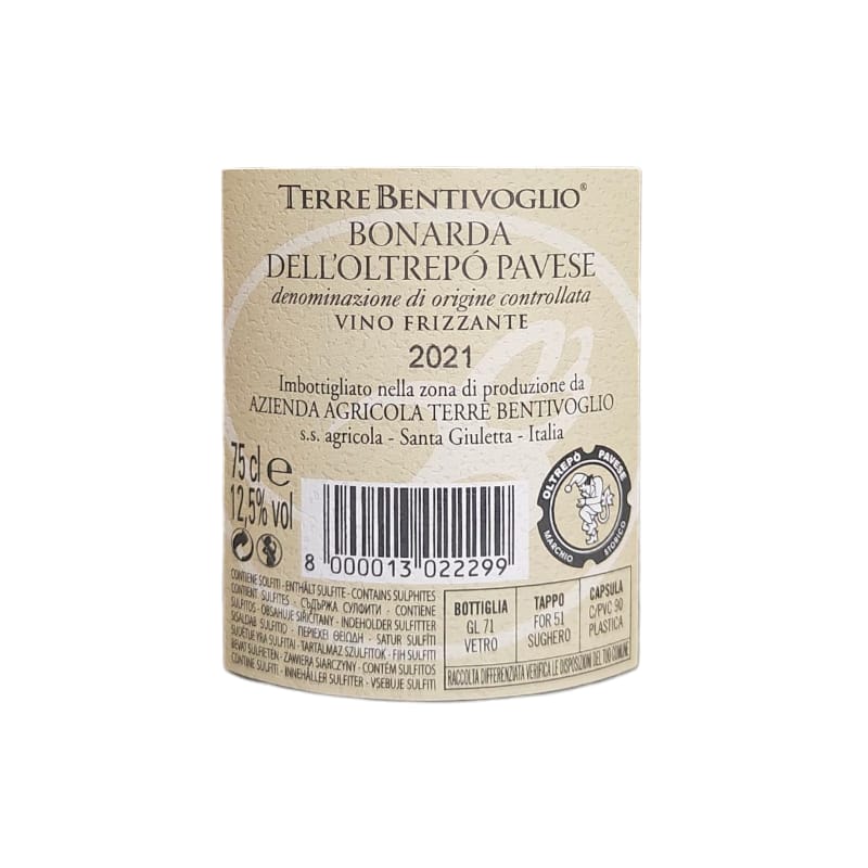 Un vino rosso frizzante dal carattere vivace e autentico, la Bonarda Terre Bentivoglio incarna l’anima conviviale dell’Oltrepò Pavese. Si presenta con un intenso colore rosso violaceo, brillante e accattivante. Al naso offre profumi fruttati e intensi, mentre al palato è asciutto, aromatico e persistente, con una piacevole effervescenza che ne esalta la freschezza. Perfetto per accompagnare salumi, formaggi stagionati, carni bianche e piatti della tradizione, è il compagno ideale per momenti di festa e condivisione. Un vino immediato e sincero, che racconta con semplicità la ricchezza del suo territorio