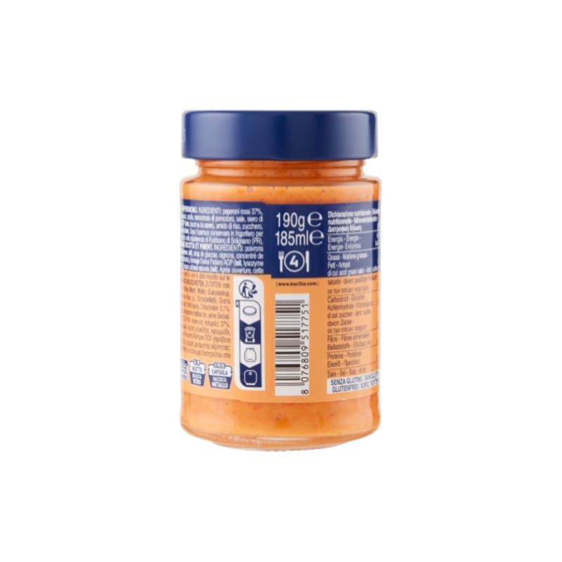 Ingredienti: Peperoni rossi 37% Oli vegetali (oliva, girasole) Ricotta 14% (siero di latte, latte) Sciroppo di glucosio Cipolla Concentrato di pomodoro Sale Siero di latte in polvere Pecorino Romano DOP (latte di pecora) Grana Padano DOP (latte, lisozima da uovo) Amido di riso Zucchero Correttore di acidità: acido lattico Peperoncino 0,1% Origano