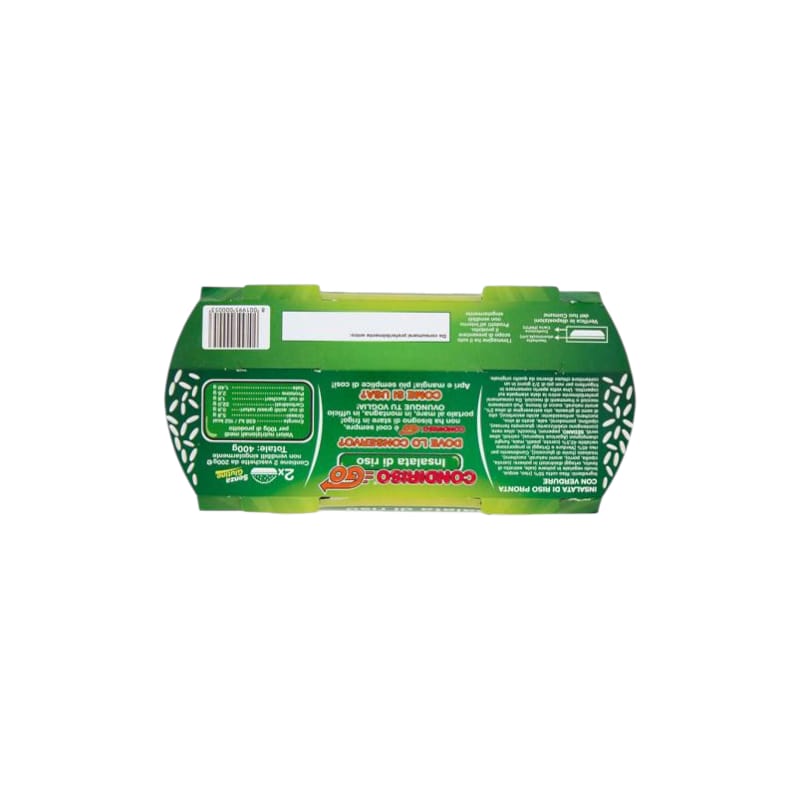 Ingredienti: Riso cotto 50% [riso, acqua, brodo vegetale in polvere (sale, estratto di lievito, ortaggi disidratati in polvere: (carota, cipolla, porro), aromi naturali, zucchero), trealosio (fonte di glucosio)]