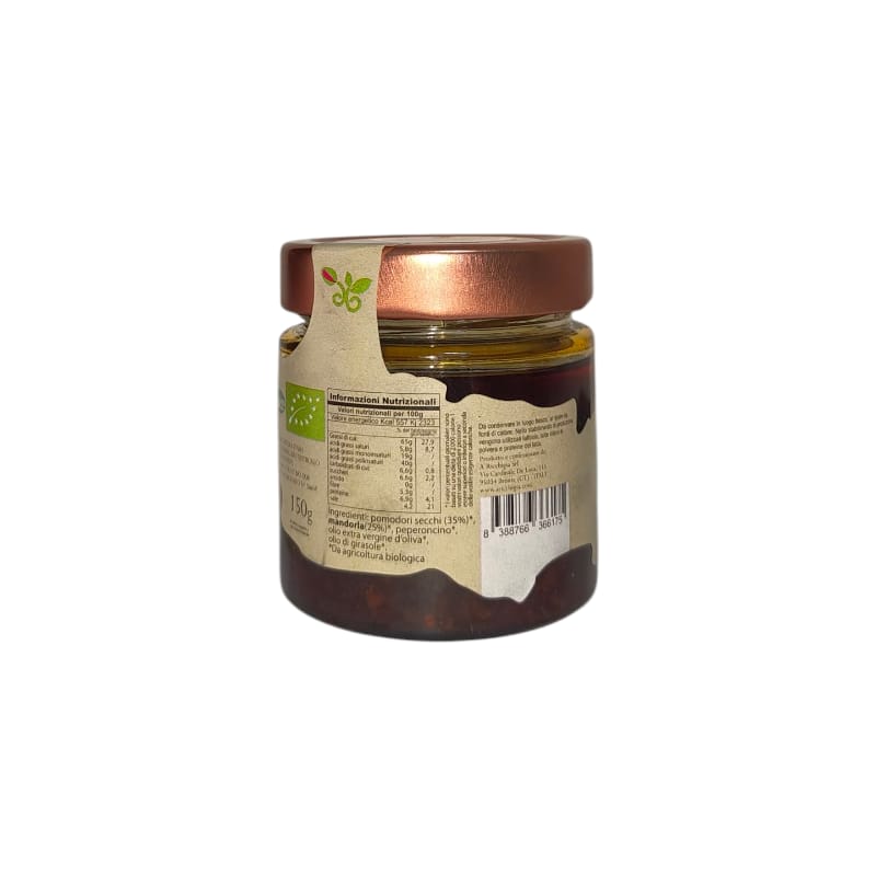 Ingredienti: pomodori secchi (35%)*, mandorla (25%)*, peperoncino*, olio extra vergine di oliva*, olio di girasole*. *Da agricoltura biologica