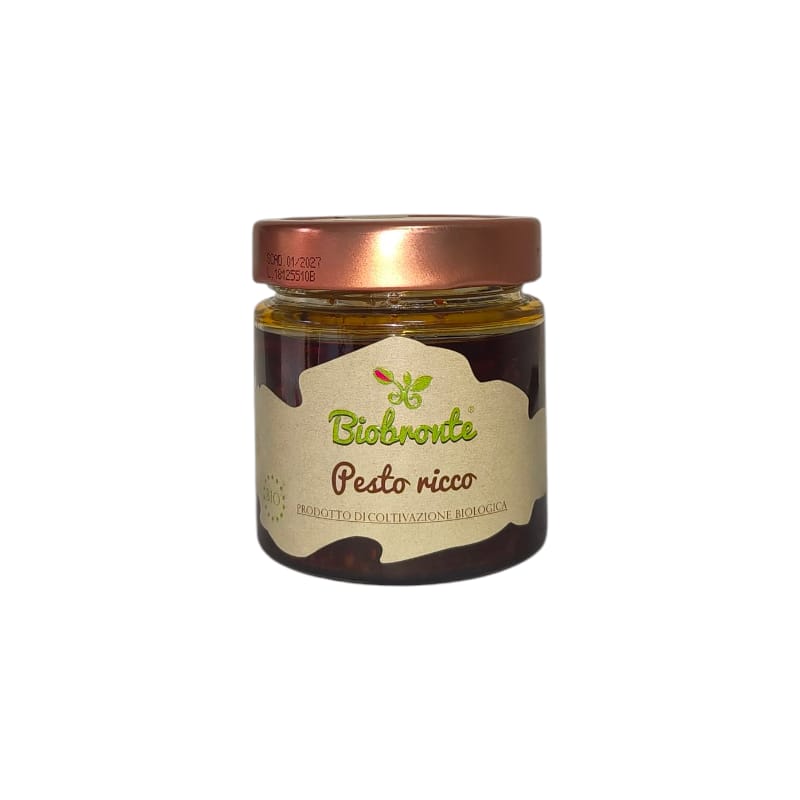 Questo pesto biologico è una crema rustica e saporita, preparata con pomodori secchi, mandorle, peperoncino e olio extravergine d’oliva. Il gusto è intenso e bilanciato: dolce e umami dai pomodori, rotondo dalle mandorle, con un tocco piccante finale. La consistenza è corposa, perfetta per condire pasta, spalmare su crostini o arricchire piatti mediterranei con carattere e autenticità.