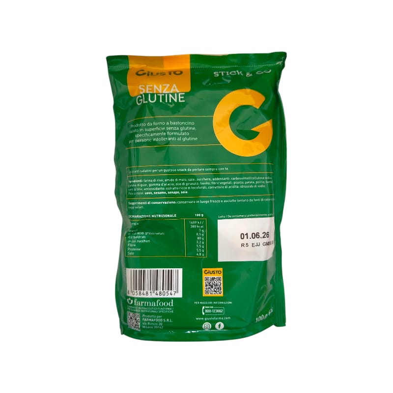 Le Giusto Stick & Go sono sfiziosi salatini croccanti a forma di bastoncino, ideali per uno snack rapido o un aperitivo in compagnia, rigorosamente senza glutine. Grazie alla loro pratica confezione da 100g, mantengono intatta la friabilità e il gusto classico dei salatini tradizionali, senza rinunciare alla leggerezza. Sono la scelta perfetta per chi cerca un momento di pausa saporito e sicuro, da portare sempre con sé.