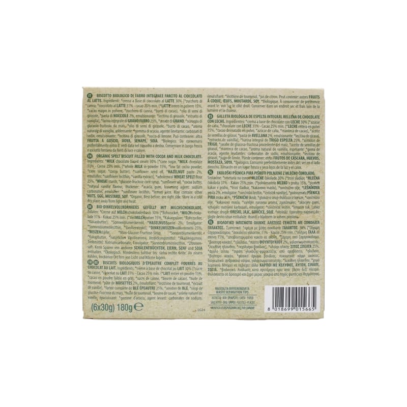 Ingredienti: *crema al cioccolato al LATTE 30% [ zucchero di canna, *cioccolato al LATTE 31%, cacao min.25% ( *LATTE in polvere 15%, *cacao magro in polvere, *zucchero di canna, *burro di cacao) *olio di semi di girasole, * pasta di NOCCIOLE 2%, emulsionante: * lecitina di giraole, *estratto di vaniglia],*farina integrale di GRANO FARRO 25%, *amido di GRANO, *sciroppo di glucosio-fruttosio da mais, *olio di semi di girasole, *burro di cacao, *aroma naturale di vaniglia, addensante: *gomma di acacia, agente lievitante; carbonati di sodio, emulsionante: *lecitina di girasole, *succo di limone. *biologico.