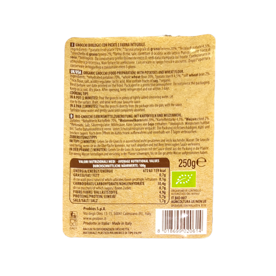 Ingredienti: *patate reidratate 70%, *farina integrale di GRANO tenero 20%, *fecola di patate 4,5%, *cruschello di GRANO tenero 2%, *farina di riso, sale, correttore di acidità: acido lattico. *biologico.