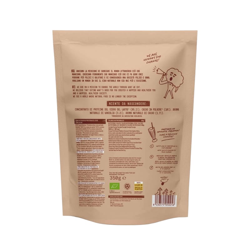 Ingredienti: *concentrato di proteine del siero del LATTE 85.1%, *cacao in polvere 10%, aroma naturale di vaniglia 3.2%, aroma naturale di cacao 1.7%. *biologico.