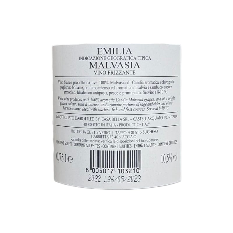 Un bianco frizzante fresco e aromatico, espressione autentica delle colline emiliane. Ottenuto da uve Malvasia di Candia aromatica, si presenta con un giallo paglierino brillante e profumi intensi di muschio e salvia. Al palato è secco, vivace e profumato, perfetto per accompagnare antipasti leggeri, carni bianche e piatti di pesce, oppure da gustare come aperitivo.