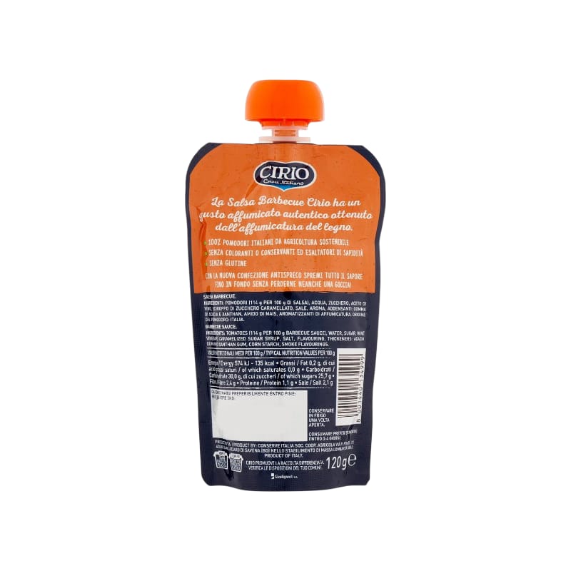 Cirio Salsa Barbecue all’Italiana è una salsa dal carattere mediterraneo, che unisce il gusto intenso del pomodoro italiano a delicate note affumicate. La sua consistenza è cremosa e vellutata, mentre il sapore bilancia dolcezza e acidità con un tocco aromatico che richiama la griglia.