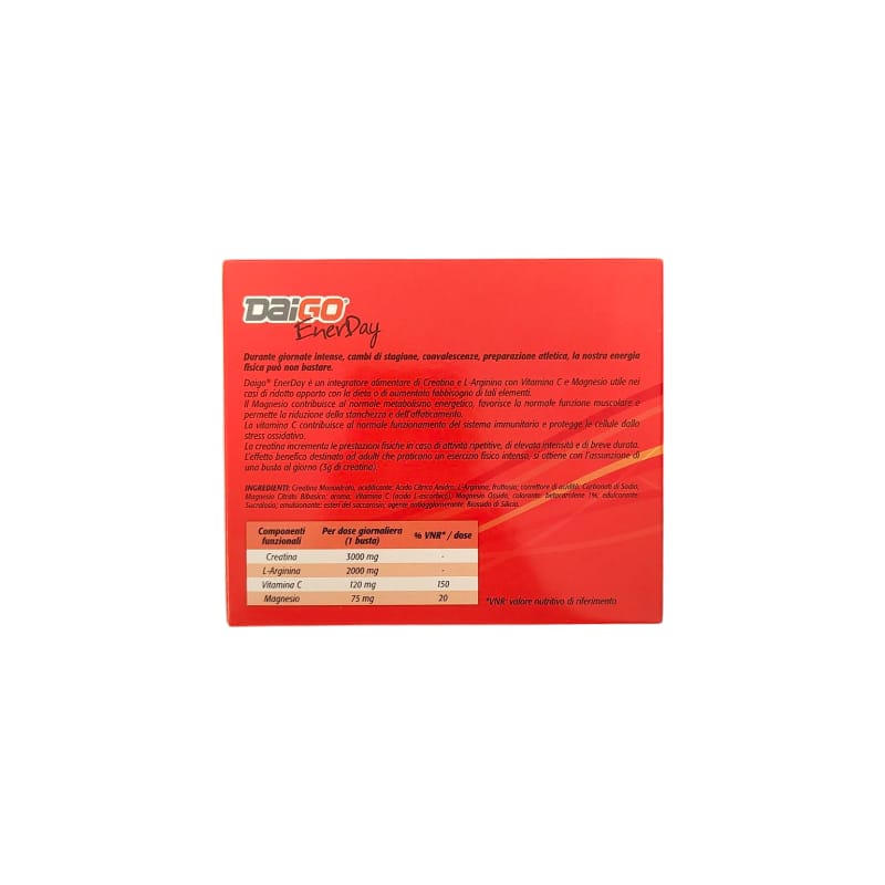 Il DAIGO EnerDay è un integratore alimentare formulato per supportare l’organismo nei momenti di maggiore affaticamento fisico e mentale, favorendo il recupero energetico e la resistenza.