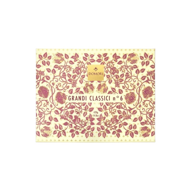 La confezione Domori “Grandi Classici 6” da 420g è una selezione di pregio che celebra la grande tradizione cioccolatiera torinese, presentata in un’elegante scatola in cartotecnica perfetta per un regalo raffinato.