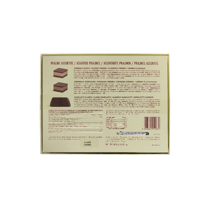 Ingredienti: cremini classici: zucchero, pasta di nocciole Piemonte IGP, pasta di cacao, burro di cacao, lecitina di soia, sale, estratto naturale di vaniglia; cremini pistacchio: zucchero, pasta di nocciole Piemonte IGP, pasta di cacao, burro di cacao, pistacchio 6%, mandorle, mandorle amare, lecitina di soia; giandujotti Criollo: zucchero di canna, pasta di nocciole Piemonte IGP 33.5%, massa di cacao Criollo 20%, burro di cacao, lecitina di girasole, sale, vaniglia.