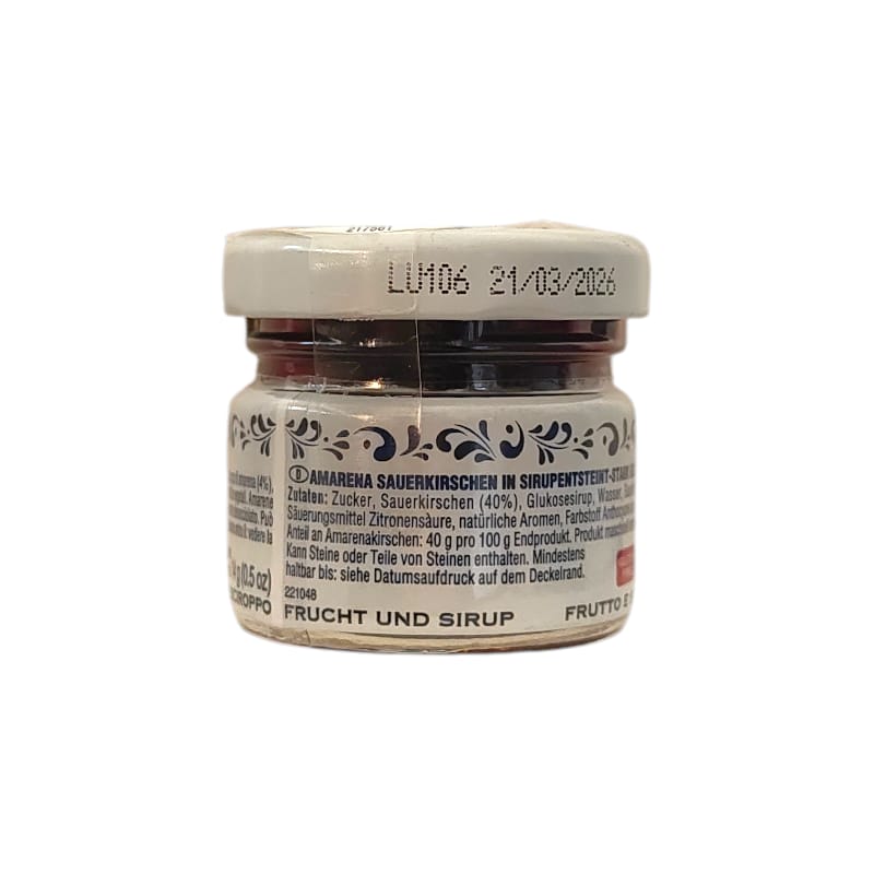 Ingredienti: zucchero, amarene (40%), sciroppo di glucosio, acqua, succo di amarene ((4%), acidificante: acido citrico, aromi naturali, colorante antociani estratti da vegetali