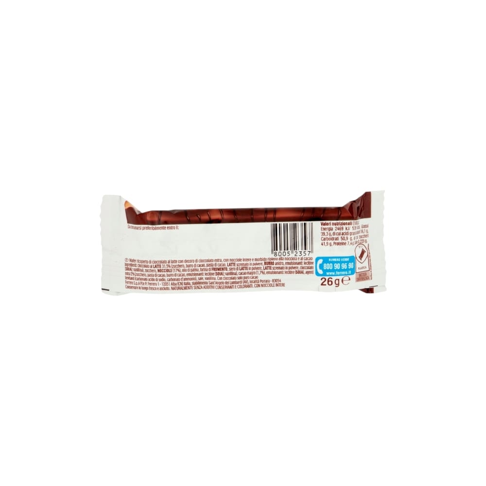 Ingredienti: Cioccolato al latte 31,5% (zucchero, burro di cacao, pasta di cacao, latte scremato in polvere, burro anidro, emulsionanti: lecitine (soia); vanillina), Zucchero, Nocciole (17%), Olio di palma, Farina di frumento, Siero di latte in polvere, Latte scremato in polvere, Cioccolato extra 2% (zucchero, pasta di cacao, burro di cacao, emulsionanti: lecitine (soia); vanillina), Cacao magro (1,7%), Emulsionanti: lecitine (soia), Agenti lievitanti (carbonato acido di sodio, carbonato d’ammonio), Sale, Vanillina, Con cioccolato solo puro cacao