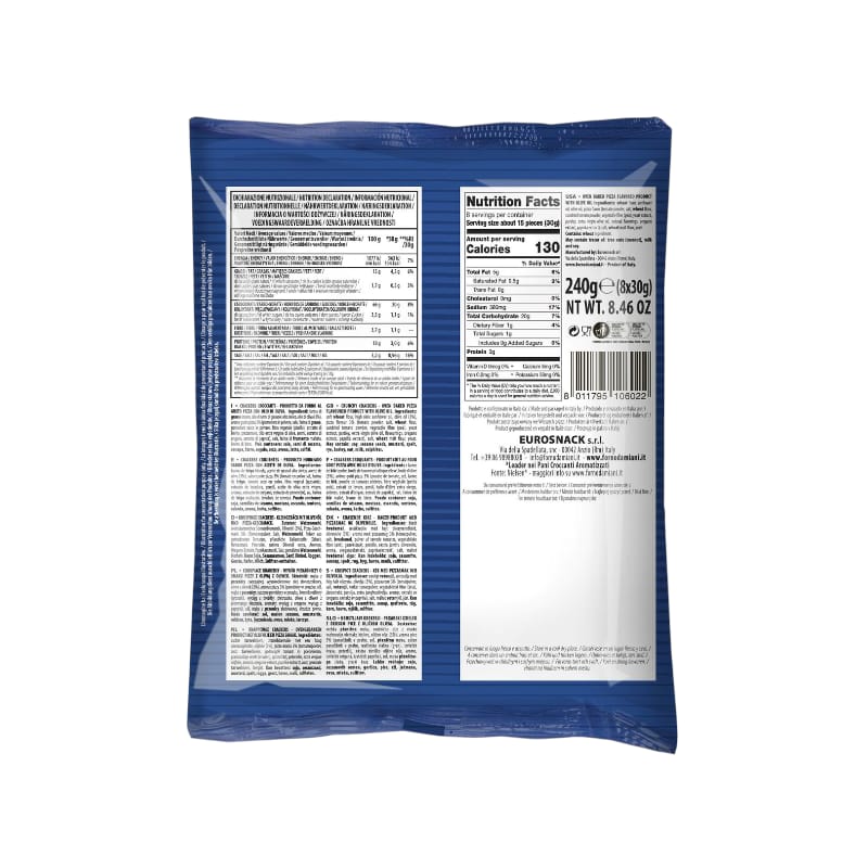 Ingredienti: Farina di grano tenero Olio di semi di girasole alto oleico Preparazione gusto pizza (4%): sale, pomodoro in polvere, aromi, destrosio, esaltatore di sapidità (glutammato monosodico), cipolla in polvere, origano, aglio in polvere, colorante (estratto di paprica). Olio di oliva (3%) Sale Farina di frumento maltato Lievito di birra