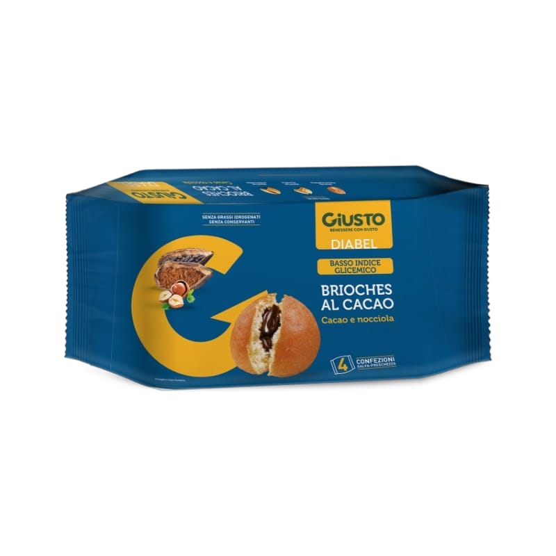 Le brioches Giusto Diabel al cacao e nocciola sono soffici merendine pensate per chi deve tenere sotto controllo l’indice glicemico senza rinunciare alla golosità. Grazie alla ricetta con fibre vegetali, offrono un cuore cremoso in un impasto leggero, rigorosamente privo di zuccheri aggiunti e senza conservanti. La confezione da 180g è perfetta per una colazione nutriente e bilanciata, ideale per iniziare la giornata con il giusto equilibrio.