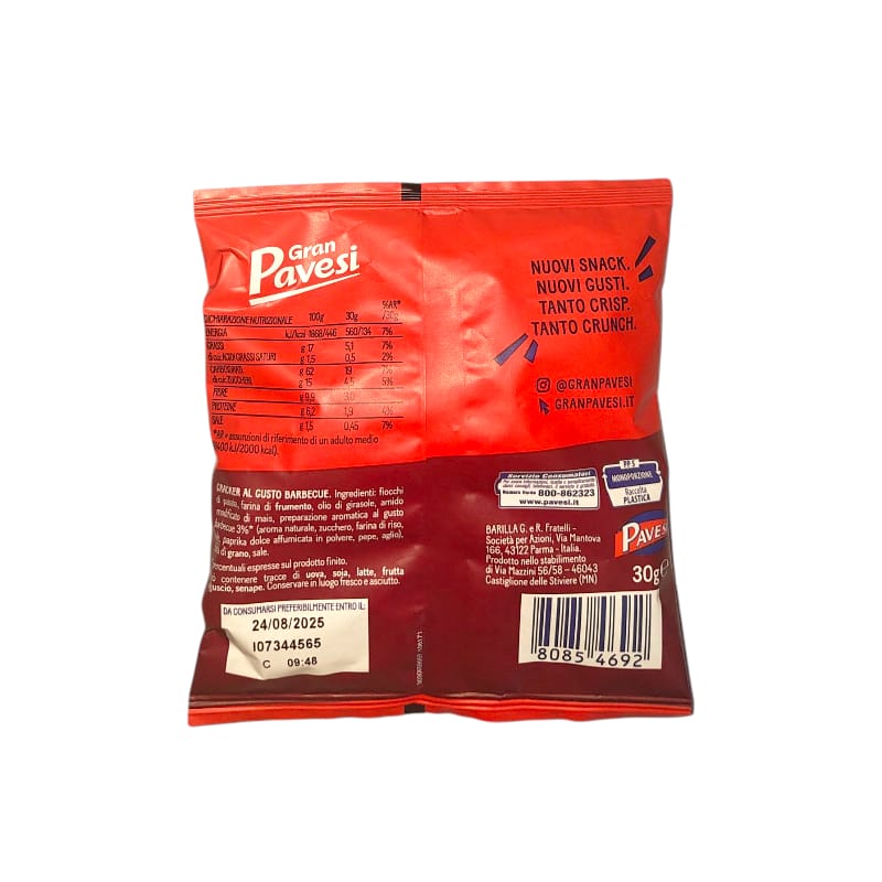 Uno snack leggero ma ricco di carattere, con sfoglie sottili e croccanti cotte al forno, aromatizzate con un intenso gusto barbecue. La combinazione di paprika affumicata, pepe e aglio regala un sapore deciso e persistente, mentre la consistenza leggera le rende perfette per uno spuntino sfizioso o un aperitivo. Sono senza olio di palma e confezionate in pratiche monoporzioni. Un’esplosione di gusto, in formato smart