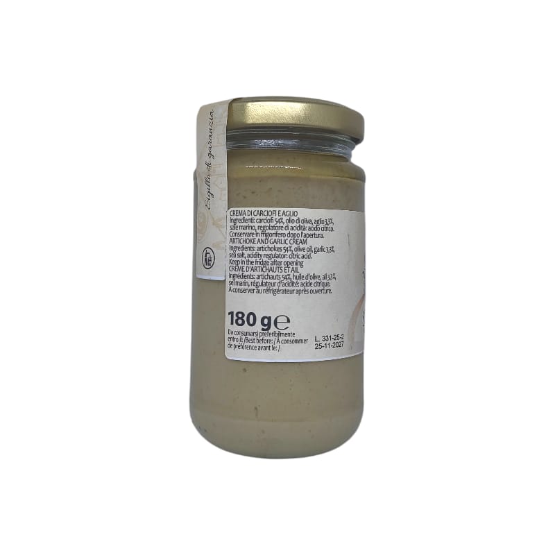 Ingredienti: carciofi 54%, olio di oliva, aglio 3,3%, sale marino, regolatore di acidità: acido citrico.