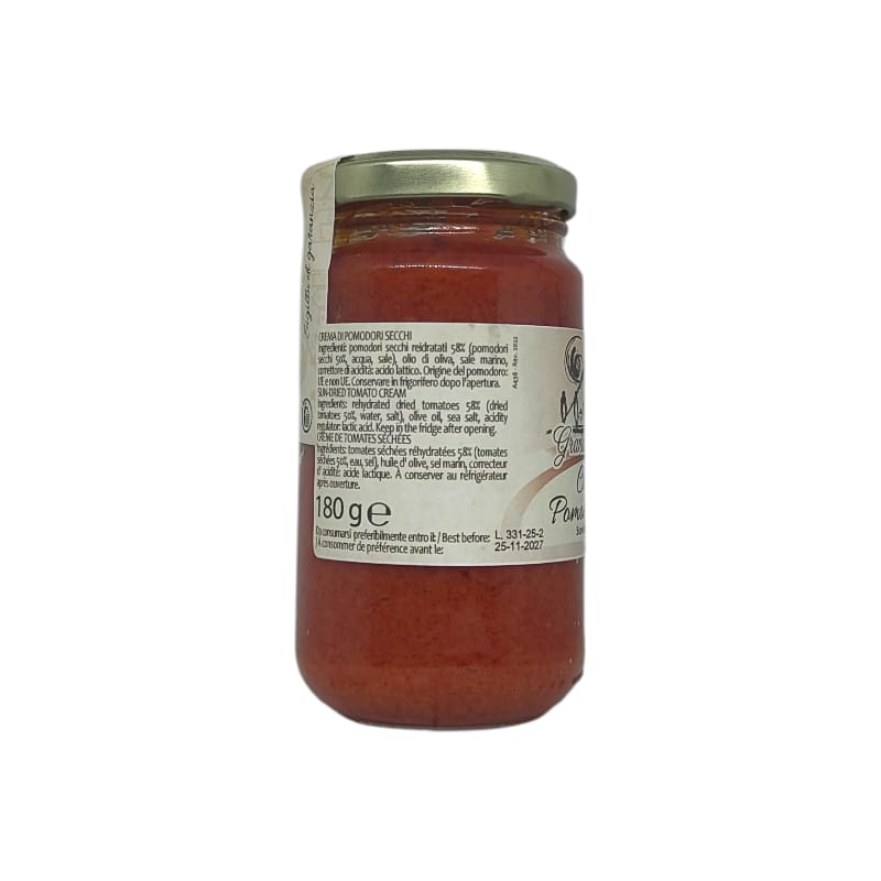 Ingredienti: pomodori secchi reidratati 58% (Pomodori secchi 50%, acqua, sale), olio di oliva, sale marino, correttore di acidità: acido lattico.