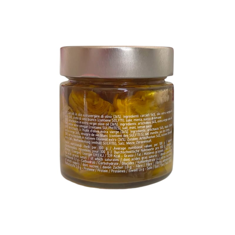 Ingredienti: carciofi, olio extra vergine di oliva, aceto di vino bianco (contiene solfiti), sale, menta e succo di limone.
