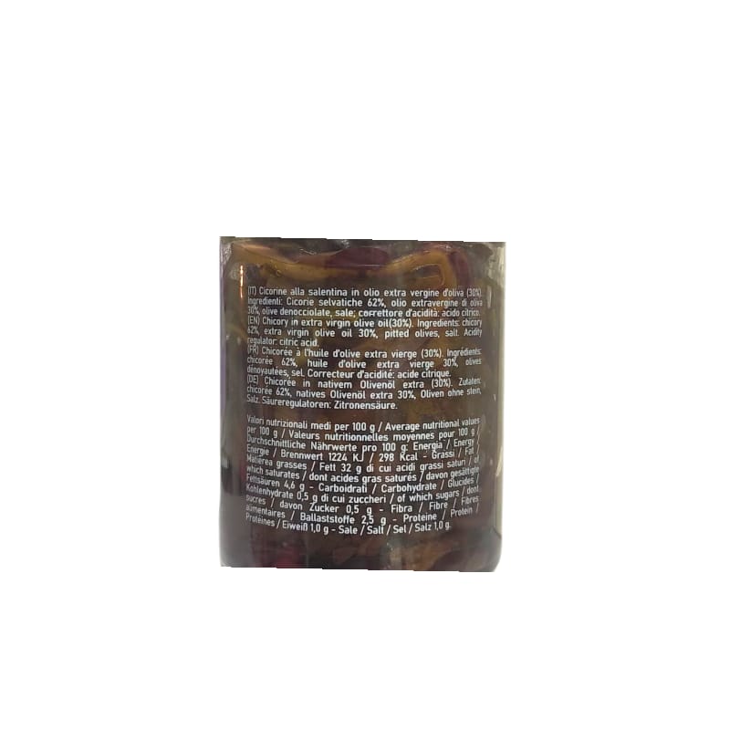 Ingredienti: cicorie 59%, olio extra vergine di olive 29%, olive denocciolate, sale, correttore d’acidità: acido citrico.