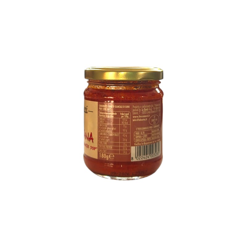 Ingredienti: polpa di pomodoro, passata di pomodoro, guanciale da “cinta senese DOP” 18%(carne suina “cinta senese DOP”, sale, pepe, destrosio, saccarosio, Antiossidante: E300 acido ascorbico, conservanti: E252 nitrato di potassio, E250 nitrito di sodio, aromi naturali), doppio concentrato di pomodoro, Olio extra vergine di oliva, vino, sale, aglio, peperoncino