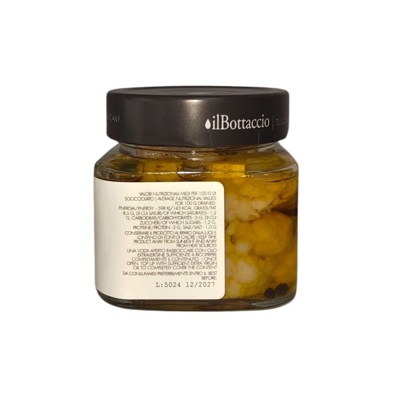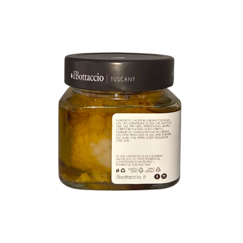 Ingredienti: Cavolfiore (origine toscana) 65%, olio extravergine di oliva 33%, aceto di mele, sale, pepe nero, peperoncino, alloro. Correttore di acidità: acido citrico