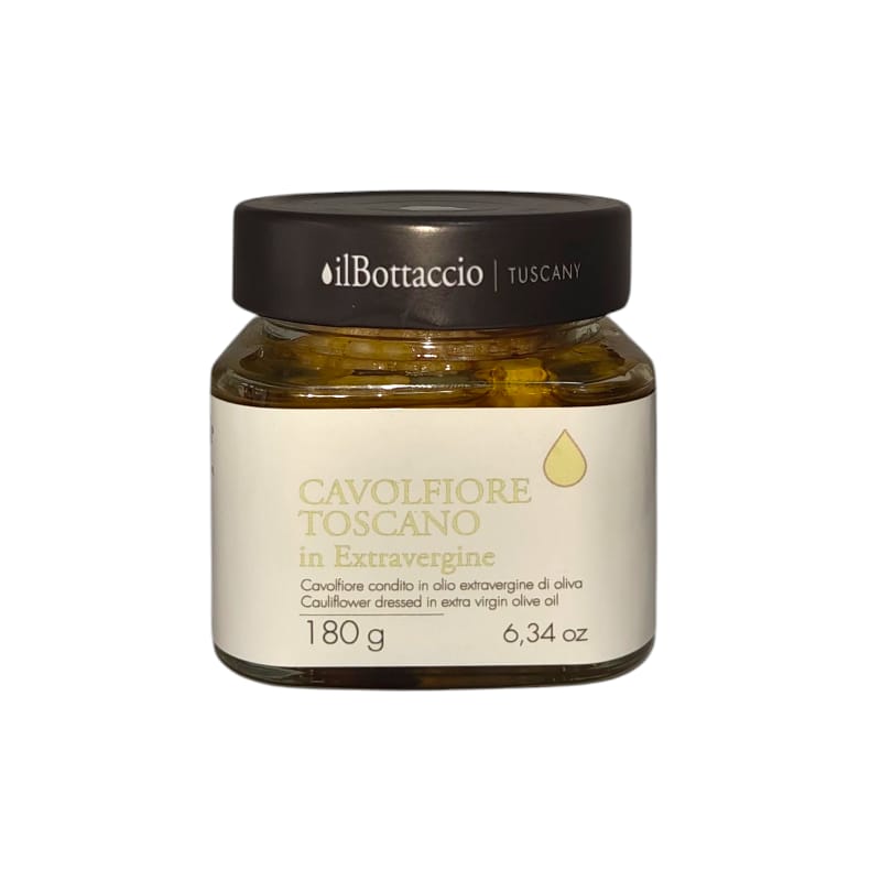 Cavolfiore Toscano condito in olio extravergine di oliva. Lavorato a mano artigianalmente secondo la tradizione toscana. Croccante e saporito, perfetto come antipasto o contorno