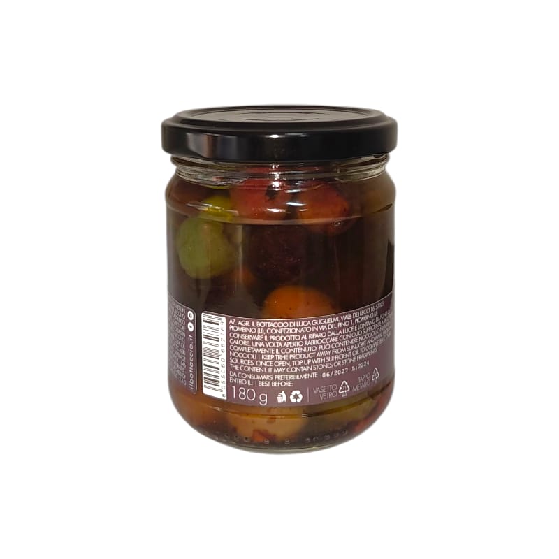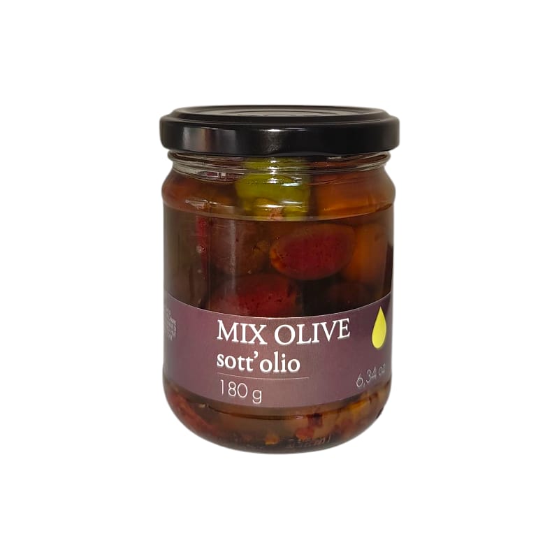 Olive miste sott’olio, ideali per antipasti a base di formaggi stagionati e salumi. Perfette per insaporire piatti mediterranei o insieme a patate, peperoni, melanzane e pomodori