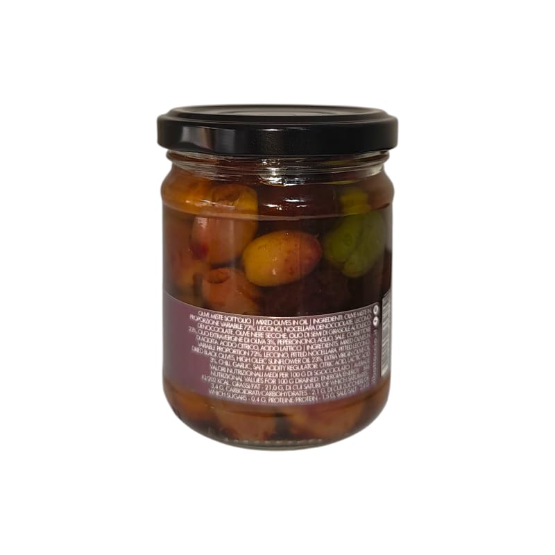 Ingredienti: Olive miste in proporzione variabile 72%, leccino, nocellara denocciolate, leccino denocciolate, olive nere secche 65%, olio di semi di girasole altoleico 23%, olio extra vergine di oliva 3%, peperoncino, aglio e sale. Correttore di acidità: acido citrico, acido lattico
