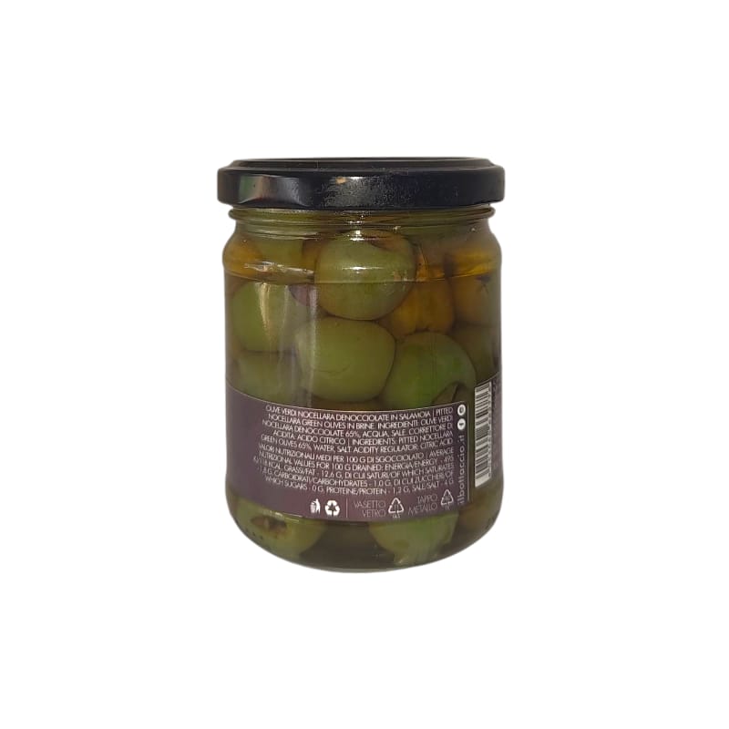 Ingredienti: Olive verdi Nocellara denocciolate 65%, acqua, sale. Correttore di acidità: acido citrico, acido lattico Antiossidante: acido ascorbico