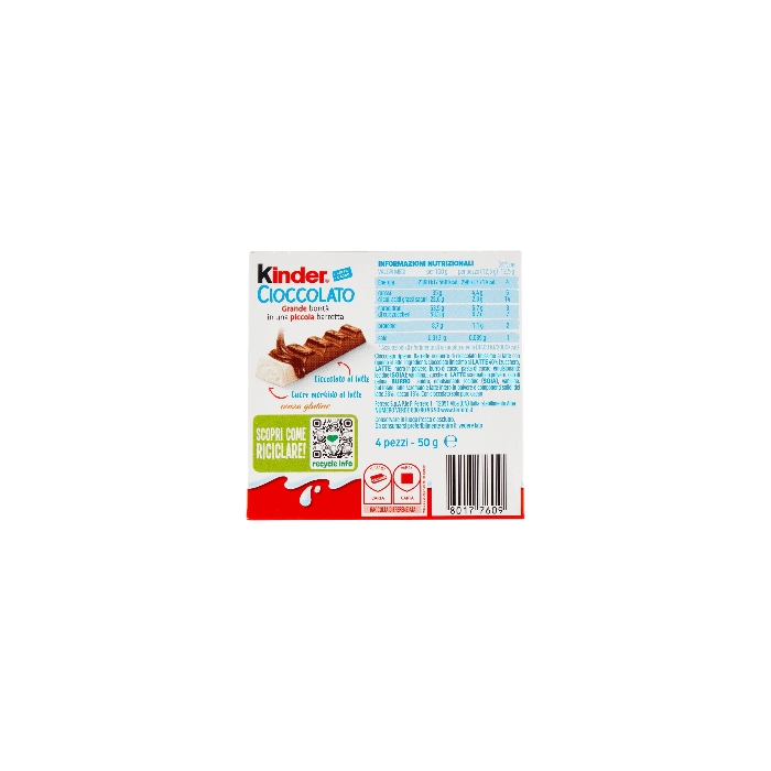 Ingredienti: Cioccolato finissimo al latte 40% (zucchero, latte intero in polvere, burro di cacao, pasta di cacao, emulsionanti: lecitine (soia); vanillina) Zucchero Latte scremato in polvere Olio di palma Burro anidro Emulsionanti: lecitine (soia) Vanillina Sul totale: latte scremato e latte intero in polvere e componenti solidi del latte 33%; cacao 13% Con cioccolato solo puro cacao