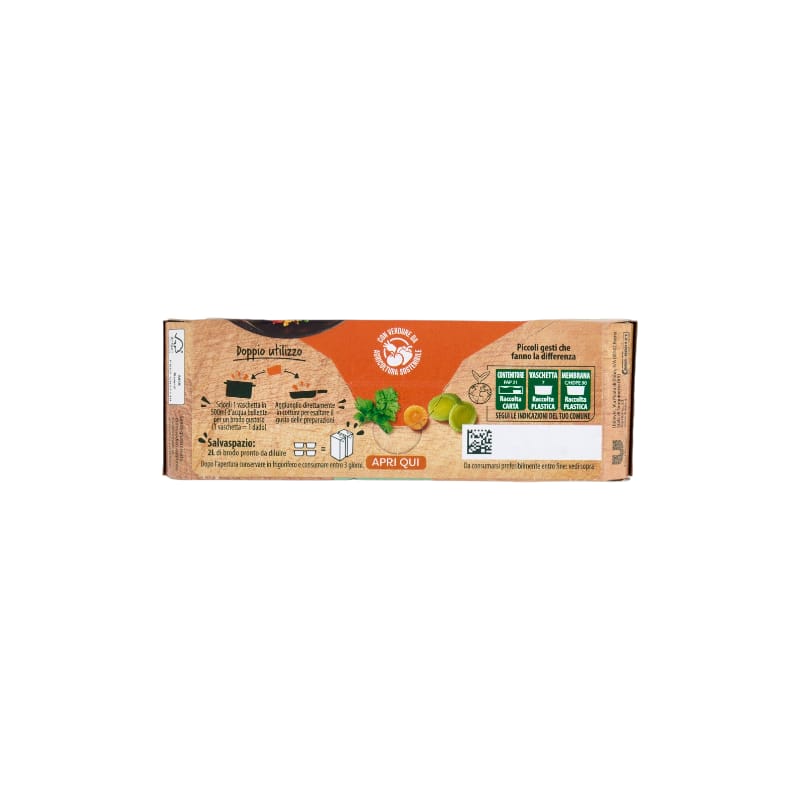 Valori nutrizionali (per 100 ml di brodo): – Energia: 22 kJ / 5 kcal – Grassi: <0,5 g – di cui saturi: <0,1 g – Carboidrati: 0,5 g – di cui zuccheri: <0,5 g – Proteine: <0,5 g – Fibre: <0,5 g – Sale: 0,85 g