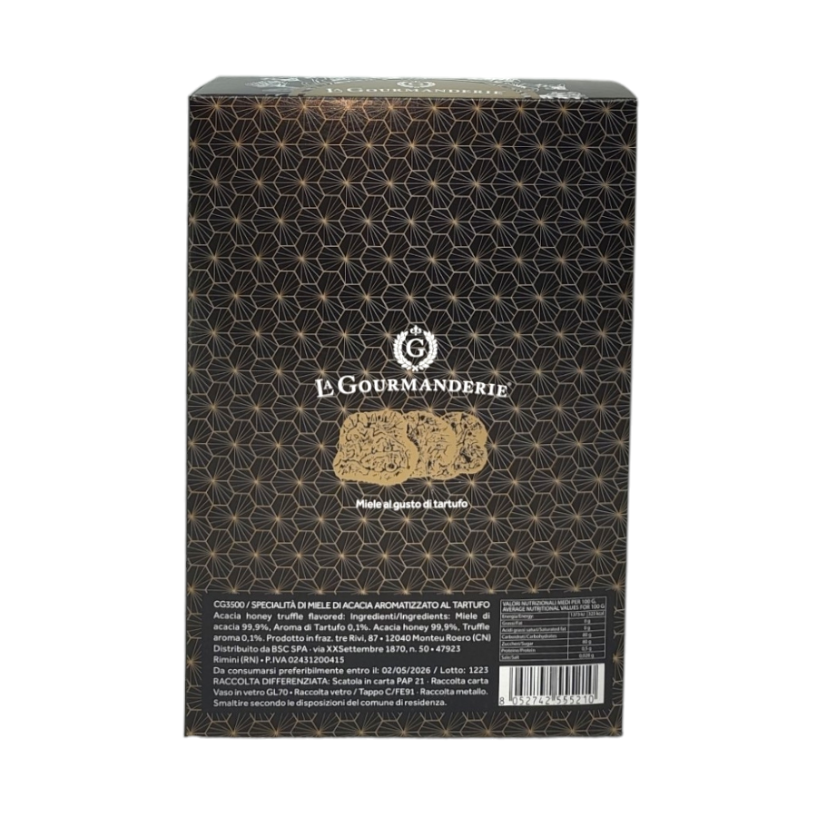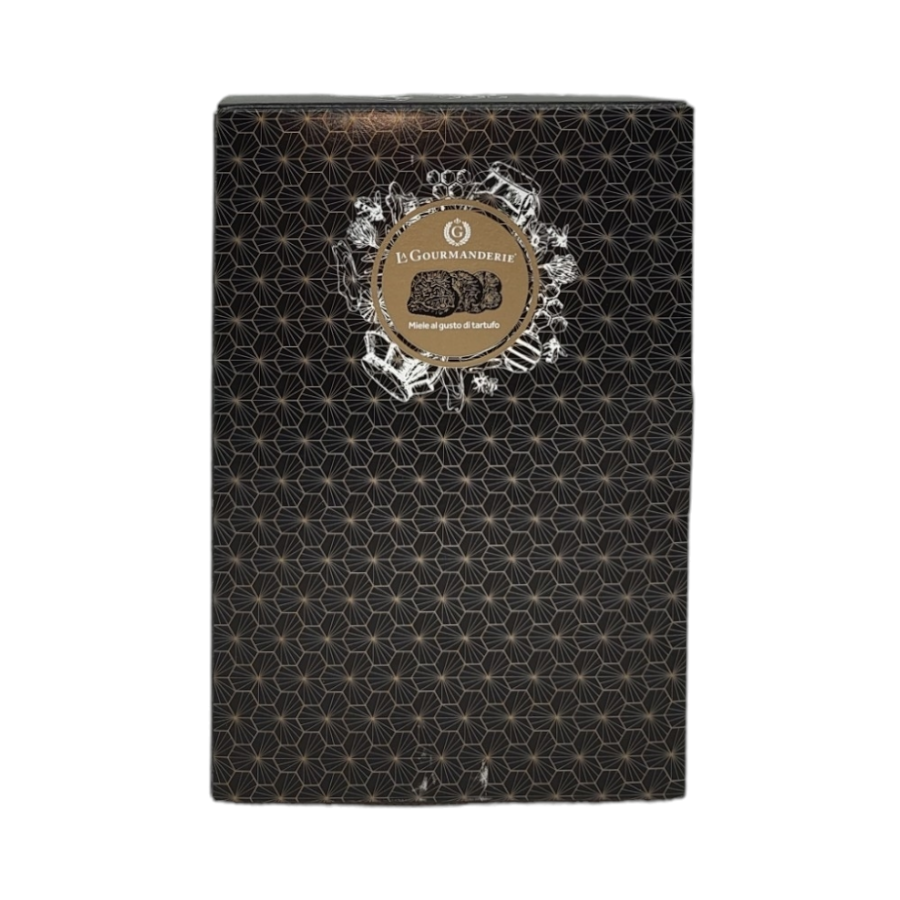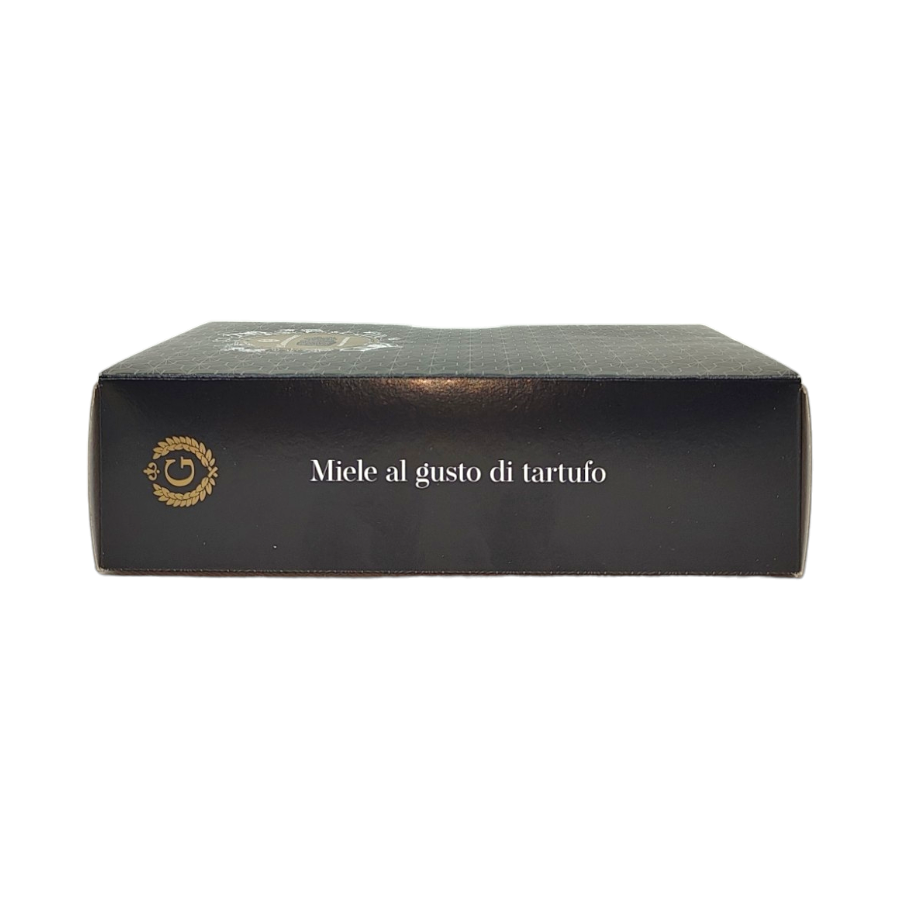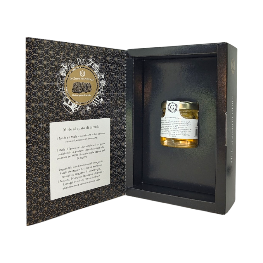 Specialità di miele di acacia aromatizzato al tartufo in un elegante cofanetto.