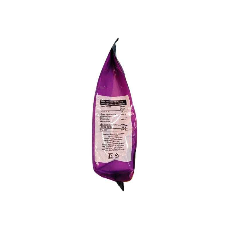 Valori nutrizionali (per 100 g): – Energia: 2369 kJ / 570 kcal – Grassi: 39.2 g – di cui saturi: 21.9 g – Carboidrati: 43.7 g – di cui zuccheri: 39.9 g – Proteine: 6.9 g – Sale: 0.08y6 g