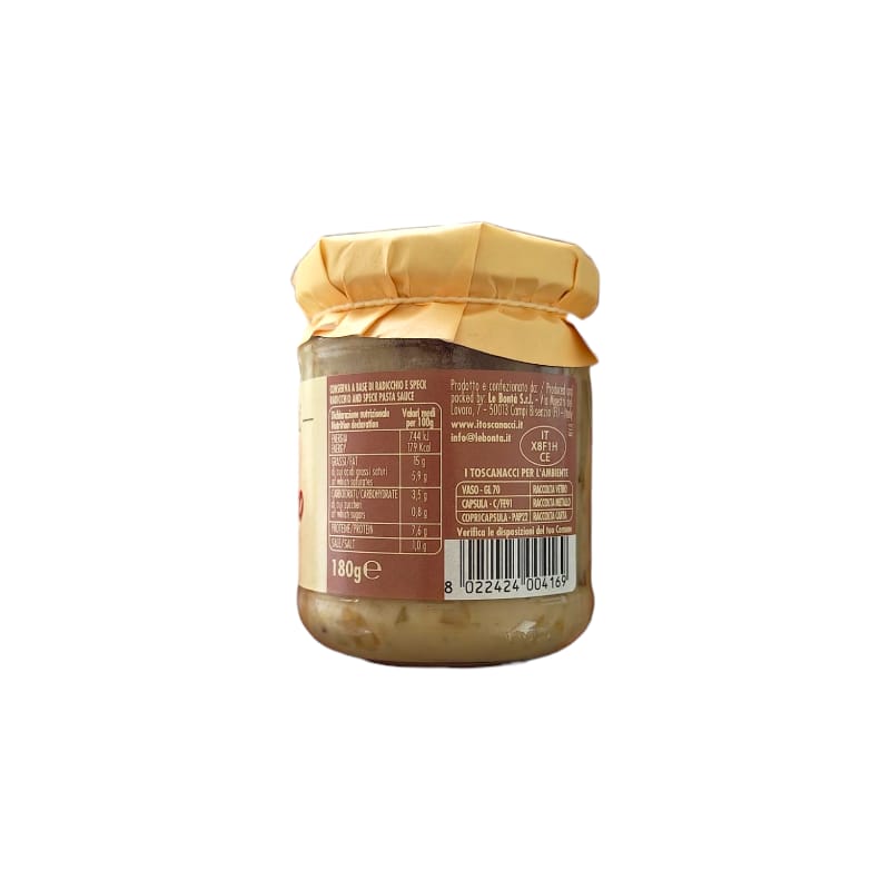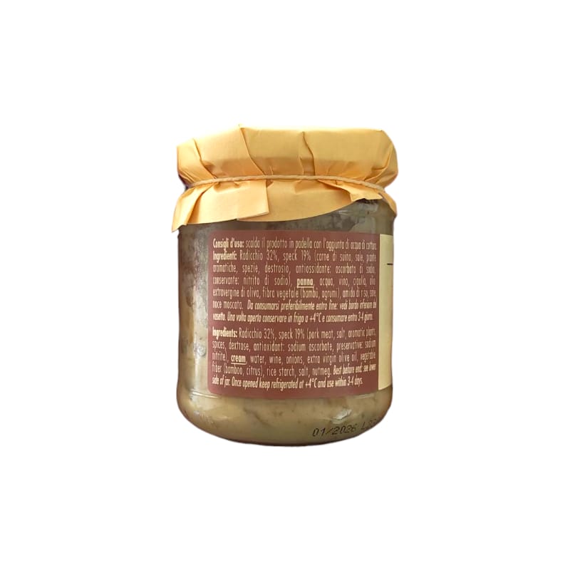 Ingredienti: Radicchio 32%, speck 19% (carne di suino, sale, piante aromatiche, spezie, destrosio, antiossidante: ascorbato di sodio, conservante: nitrito di sodio), panna, acqua, vino, cipolla, olio extravergine di oliva, fibra vegetale (bambù, agrumi), amido di riso, sale, noce moscata.