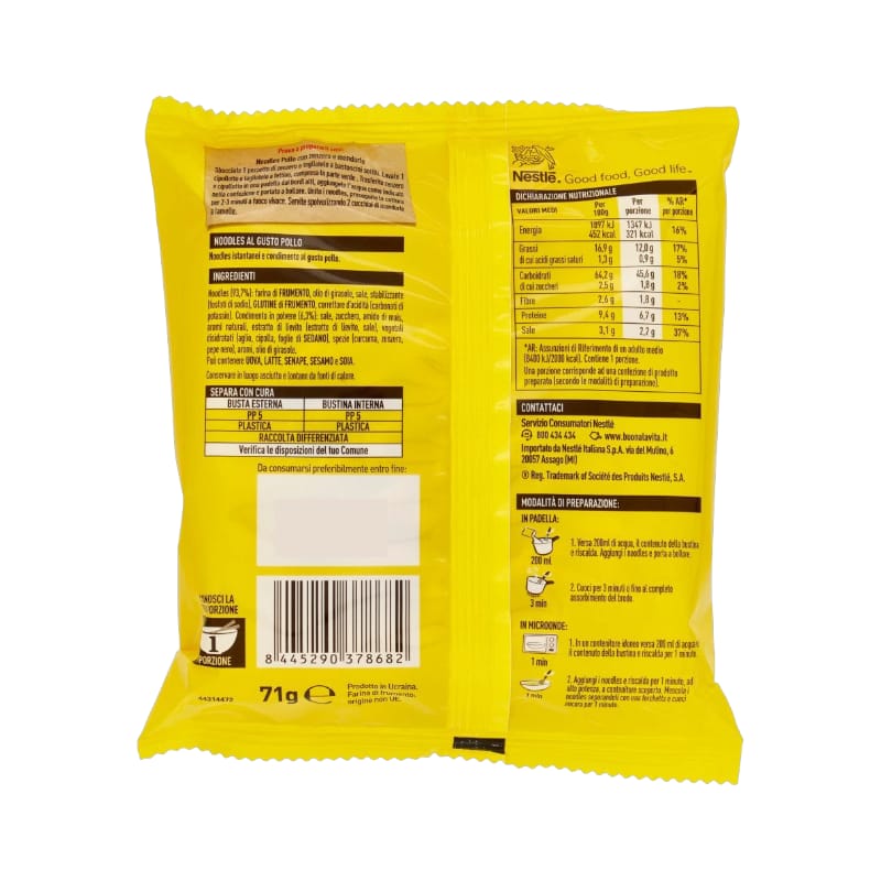 Ingredienti: Noodles 93,7%: farina di FRUMENTO, olio di girasole, sale, stabilizzante (fosfati di sodio), GLUTINE di FRUMENTO, correttore di acidità (carbonati di potassio)