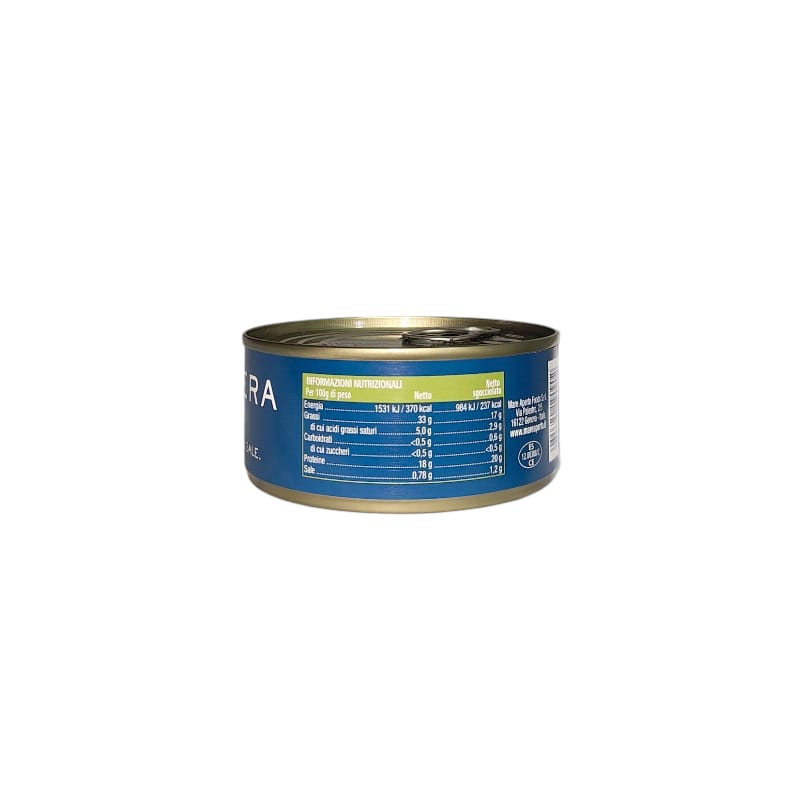 Valori nutrizionali (per 100 g sgocciolato): – Energia: 984 kJ / 237 kcal – Grassi: 17 g – di cui saturi: 2.9 g – Carboidrati: 0.6 g – di cui zuccheri: <0.5 g – Proteine: 20 g – Sale: 1.2 g